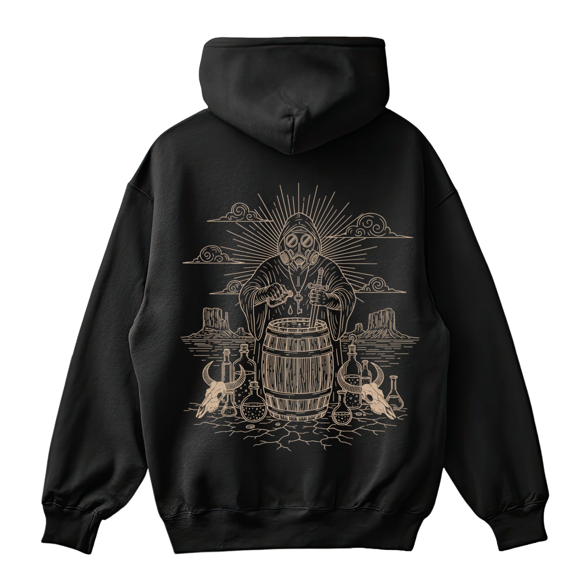 On the back, The Alchemist stands in the Texas desert, conjuring something dangerously delicious through the ancient arts of fighting, stealing, and drinking.